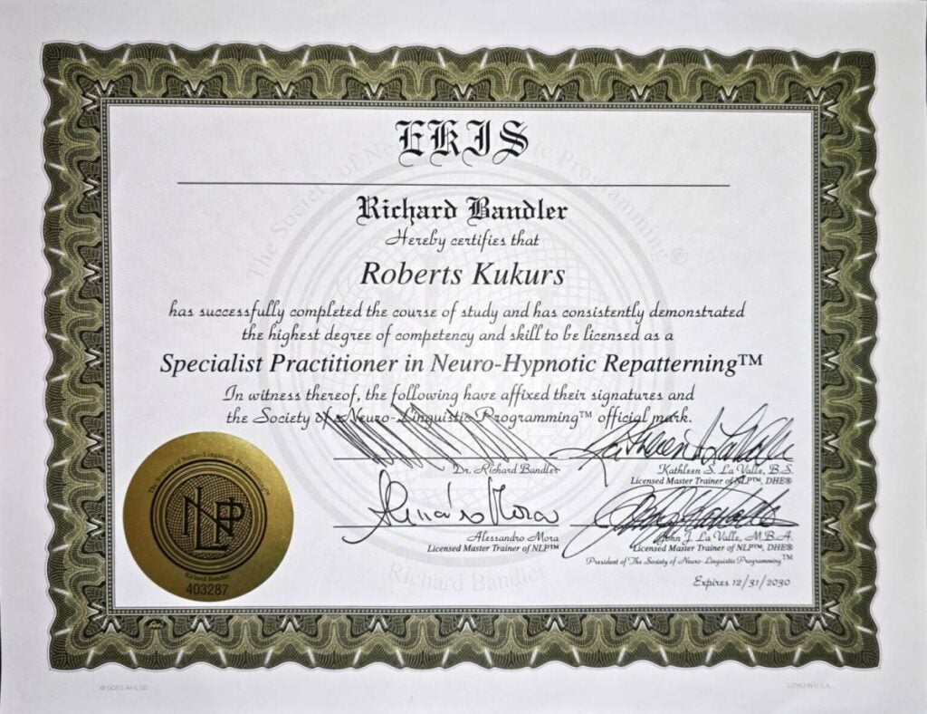 Here is the cert I got from the Hypno TransFormation Academy that I attended in my home country, Latvia: